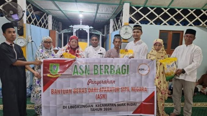 Kegiatan dimulai dengan solat magrib bersama dan membaca yasin bersama disejalankan dengan ASN berbagi dari PNS diseluruh instansi diKecamatan Suak midai berupa (Beras) untuk Imam Masjid dan Marbot.